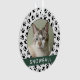 Personnalisez ce design empreinte de patte de décoration de Noël avec votre nom de chat (ou de chien) et une photo préférée de votre membre de la famille de la fureur. L'Arrière - plan comprend un motif empreinte de patte moderne noir et blanc avec une bande d'accent vert chasseur.