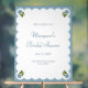 Accueillez vos invités avec une élégance discrète en utilisant ce panneau de baby shower avec des hortensias bleus. Encadré par des bords doucement festonnés et un fond bleu poussiéreux, ce design est orné de délicates fleurs bleues dans chaque coin pour un style classique. La combinaison de l'écriture raffinée et de la police à empattements se marie parfaitement avec les thèmes de jardin, de bord de mer ou d'inspiration française. Un favori polyvalent pour les fêtes printanières et estivales, ce panneau personnalisé ajoute du charme et de la coordination à votre célébration.