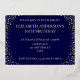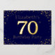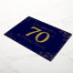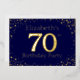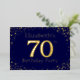 70e anniversaire invitation à la fête. Personnalisez avec le nom de la personne d'honneur. Le numéro 70 dans une grande police de style étincelant. Encadré de points dorés en chute. Placé sur un bleu foncé très saturé. Entrez les détails de la fête au verso de l'invitation en utilisant les modèles, également envoyé sur bleu foncé encadré de diamants.