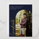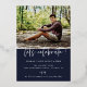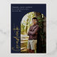 Diplômé. Script moderne, en feuille d'or. Faire-part/invitation de diplôme. Photo cadre en arc sur le devant, photo simple sur le dos avec couleurs bleu marine arrière - plan.