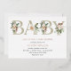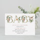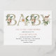 Invitation à Baby shower pressé avec "bébé" en lettres d'or élégantes avec à feuillage persistant d'hiver et pinecones. Parfait pour un bébé d'hiver. Customisez avec vos informations. Sélectionnez parmi plusieurs options de feuille différentes.