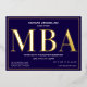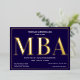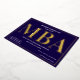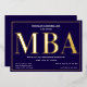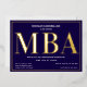 Une invitation à la fête de remise de diplômes MBA avec feuille d'or, texte blanc, et un arrière - plan bleu. Ajoutez simplement vos informations, ajoutez cette invitation à votre panier et célébrez cette réalisation majeure. Bleu Gold MBA Graduation Foil Invitation Jours fériés Design | ©Melissa Patton - Designer