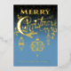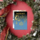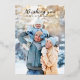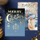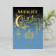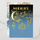 Customisez votre nom de famille sur ce traitement de typographie bleu et or de "Joyeux Noël" avec des ornements vintages suspendus en papier peint. Ajoutez votre photo de famille au verso de la carte.