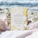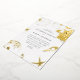 Ce faire-part de mariage présente des illustrations de coquillages et d'étoiles de mer en feuille d'or et des polices élégantes dans lesquelles toutes vos informations personnalisées sont écrites. Consultez notre magasin pour plus d'articles correspondants de cette collection mariage.