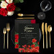 Floraux audacieux. Luminosité dorée. Pura elegancia (Elégance pure). Cette invitation de mariage moderne apporte le drame avec des roses rouges et des accents d'or luxueux - parfait para una célébración (pour une célébration) plein de pétillant, pasión (passion), et style intemporel.