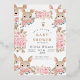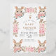 Cette invitation baby shower présente un mélange enchanteur de fantaisie et d'élégance avec son design charmant. L'arrière - plan blanc est encadré de quatre charmantes illustrations de lapins, chacune surplombant derrière un bouquet de délicates roses et blanches, entrecoupées de feuilles verts et de touches de feuillage brun. Les lapins, avec leurs grands yeux expressifs et leurs longues oreilles, apportent une touche ludique aux fleurs d'aquarelle sophistiquées. Cette invitation est spéciale car elle combine harmonieusement l'innocence et la joie d'accueillir une nouvelle vie avec la beauté de la nature. Le mélange artistique d'éléments floraux doux et d'animaux adorables en fait un lieu idéal pour célébrer les moments précieux qui ont conduit à l'arrivée d'un bébé. Il saisit l'essence de l'amour, de la chaleur et de l'anticipation, ce qui en fait un gardien idéal pour les parents à être et leurs proches. Utilisé pour un baby shower ou un faire-part de naissance, ce design ne manquera pas de laisser une impression durable et de créer des souvenirs chéris.