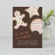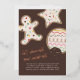 Enfants Invitations de tous âges pour décorer les biscuits de Noël et fêter la saison des fêtes avec cette invitation festive décorant les biscuits de Noël. Les biscuits en forme de pain d'épice, d'étoile et de cercle sont décorés avec plaisir avec le glaçage et une variété d'arrosées colorées. L'illustration est placée sur un arrière - plan brun à la texture tachetée, et accompagnée de l'expression "décorons et fêtons..." en lettres manuscrites à pression de feuille.