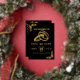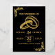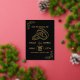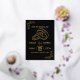 Invitation de mariage élégante avec feuille dorée et noire. Un cadre orné et doré ainsi que des ornements décorent un fond noir foncé élégant pour un effet dramatique