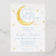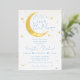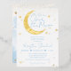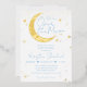 Bienvenue à votre petit et fêtez la fête des parents pour être avec cette invitation fantaisiste avec la lune d'or, les étoiles et les empreintes bleues de bébé. C'est un design parfait pour les baby showers bébé garçon et plus encore!