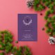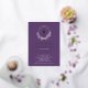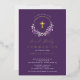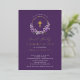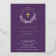 Belles invitations à la première communion Gold Foil avec une couronne de lilas lavande et une croix de feuille d'or sur un arrière - plan violet profond. Retournez notre invitation pour voir un retour de coordination pour une touche spéciale supplémentaire.