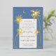 Ce faire-part de mariage boho serait parfait pour toute personne qui accueille un mariage tropical de destination ou toute personne qui veut une ambiance estivale crépusculaire pour son invitation. Le design présente des palmiers brillants en feuille d'or avec une lune et des étoiles sur un arrière - plan bleu doux avec et l'inverse de l'invitation a un motif étoile boho à assortir.