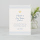 Timeless baptism invitation that combines soft blue stripes on light beige background, a delicate gold foil shell cross symbol, and handscript font. Elegant and modern.