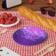 Assiettes de fête d'anniversaire Purple Sparkle Club Vibe. Personnalisez avec n'importe quel texte. Les articles assortis sont disponibles.