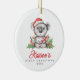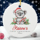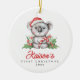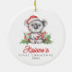 Baby Koala First Christmas Custom Name Ceramic Ornament — Le précieux modèle de Noël "xmas" personnalisé "bébé" dispose d'un adorable ours koala aquarelle portant un chapeau santa et un sucre de canne de vacances, assis sur le feuillage d'hiver avec baies. Les zones de texte permettent de personnaliser facilement le nom d'un bébé dans une police manuscrite en caractères gras de script de calligraphie rouge, et l'année de naissance dans une simple et minimaliste sans serif. Les deux côtés de cette décoration personnalisée de l'arbre de conservation sont identiques.