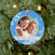 Cet ornement photo "Notre premier Noël" a un cadre de flocon de neige en argent bleu avec un "ruban" blanc avec du texte entièrement personnalisable, et un retour de flocon de neige bleu assorti.