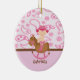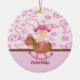 C'est un souvenir adorable. C'est un ornement avec un blanc et la copie occidentale rose sur le dessus et le bas est rose-clair avec une bande brune le long de elle. Au milieu est une cow-girl de bébé utilisant des bottes de cowboy roses, une couche-culotte rose et le casquette de cow-girl. Elle s'assied sur un cheval de basculage brun avec un fond rose et des rênes sur le cheval. Vérifiez les nombreuses autres couleurs et conceptions que nous avons. ©babystar