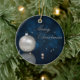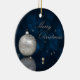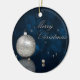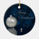 Illustration de Noël élégante : boule de Noël argentée et perles blanches sur un arrière - plan de livre bleu foncé.