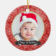 Flocons de neige blancs sensibles au-dessus d'un arrière - plan rouge. Entourez la photo au milieu encadré en or. Facile à customiser pour créer un souvenir spécial de ęr Noël du bébé ! Veuillez remplacer la photo de modèle avant d'acheter.