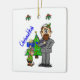 Voici un ornement capricieux de Chrismukkah qui met en scène un homme juif avec un saint sur son kipper et un faux orteil sur sa tête. Un des elfes de Père Noël lui apporte un cadeau de Noël. Au dos, personnalisez-le avec l'année en cours ou un nom de famille ? Conçu par Sheila Cicchi, Brownielocks.com, Tous droits réservés.
