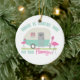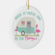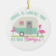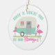 Un ornement comportant une illustration d'une rétro maison de remorque avec la rayure de turquoise et de deux flamants en plastique roses dans la cour. Le texte indique que "à la maison est où vous mettez vos Flamants roses !"