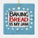 "Baking Bread Is My Jam" est un design de texte mignon en bleu avec du texte en noir et rouge, avec une forme d'accent blanc et des points blancs texturés blancs qui l'entourent.