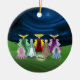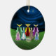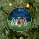 Une crèche très colorée avec la Vierge Marie, Joseph, le bébé Jésus, deux petits anges et les trois hommes sages, tous vêtus de vêtements très colorés, sur un pré verdoyant et un ciel bleu foncé avec une étoile brillante qui brille.