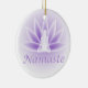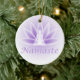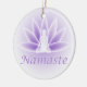 Un lotus violet doux fleurit avec une femme yoga de l'artiste-designer Charmaine Paulson sur un ornement de Noël.