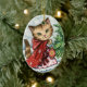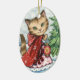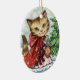 Ce chat tigré brun mignon accroche un ornement de Noël dehors sur un arbre de sapin. Elle aime son nouveau manteau d'hiver, qui est décoré des étoiles de flocon de neige. Illustration par Carmen Medlin.