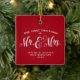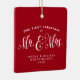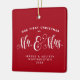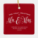 Un cadeau parfait pour les jeunes mariés ou votre nouveau marié ou marié - un ornement à deux côtés avec une tache pour une photo et "notre premier Noël en tant que Monsieur. & Mme" traitement de type. La couleur arrière - plan rouge festive est modifiable en cliquant sur "personnaliser".