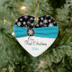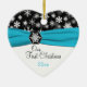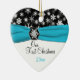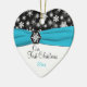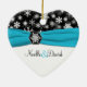 Souvenez-vous de votre journée spéciale avec ce magnifique flocon noir et blanc, ornement en céramique en forme de coeur avec un ruban bleu aqua FAUX et médaillon de flocon de neige. Vous pouvez customiser le texte pour dire ce que vous voulez. Il correspond également à la collection de mariages de flocons de neige noirs, blancs et d'aqua présentée ci-dessous.