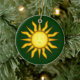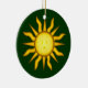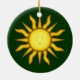 Ornement vert-foncé comportant le glyph bronze-jaune du soleil avec le visage électrique de débouché.