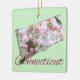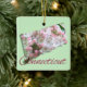 feuilles à feuillage persistant et fleurs en étoile captivantes, accentuées par des taches bordeaux distinctives, le laurier de montagne est l'un des plus beaux arbustes en fleurs d'Amérique. Egalement connu sous le nom d'ivybush, laurier de mouton, calico bush, lambkill (parce que les plantes sont très toxiques, surtout pour les petits animaux), clamoun et cuillère (parce que les Amérindiens fabriquaient des cuillères à partir du bois). Les fleurs de laurier représentent l'ambition, le succès et la renommée. Bien qu'elles aient l'air très similaires, il y a une GRANDE différence entre Mountain Laurel et Bay Laurel (utilisé en cuisine et pour faire les fameuses et laudibles couronnes). Contrairement à Bay Laurel, presque toutes les parties du Mountain Laurel sont toxiques pour les humains et les animaux. Fleur d'État de Pennsylvanie, Mountain Laurel offre un spectacle floral époustouflant en mai et juin avec des fleurs en roses, blancs et rouges. Mais ce design n'est pas seulement un hommage à cette fleur étonnante, il rend également hommage à notre 5ème état, le Connecticut. Sur 50 états, le Connecticut est le 48ème plus grand. . . ou 3e plus petite de l'union. Pour un état qui, TECHNIQUEMENT, n'est pas sur l'océan (Long Island Bay est en fait un estuaire), le Connecticut a une riche histoire maritime et un musée maritime extraordinaire à Mystic. Bien que le surnom officiel soit "L'État de la Constitution", le Connecticut est aussi connu comme "l'État des Noix de muscade", "l'État des Dispositions" et "le pays des Habitudes permanentes". La finance et l'assurance sont les plus grandes industries du Connecticut ; peut-être pas si surprenant qu'il soit aussi le berceau de Charles Dow, le fondateur du Wall Street Journal et Dow Jones AND J. P. Morgan, financier et philanthrope. Bien sûr, c'est aussi le lieu de naissance, entre autres notables, de l'ancien président George W. Bush, Katharine Hepburn, Meryl Streep et Noah Webster — comme dans Webster's Dictionary. Ce design enchanteur, célébrant le 5ème ajout aux Etats-Unis, offre un aperçu de l'état du Connecticut, rempli de leur fleur d'état, le magnifique Mountain Laurel. Ce joli design est recouvert d'un "CONNECTICUT" rose coordonné sur ce magnifique ornement. Que vous soyez en train de décorer un arbre de vacances avec des souvenirs de vos voyages ou de rendre hommage à notre 5ème état, ce merveilleux ornement est un excellent choix.