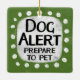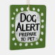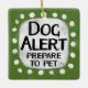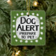Un design animal typographique irrévérencieux et mignon qui dit "Dog Alert, Prepare To Pet". Il présente du texte noir et rouge sur un rectangle blanc avec des points blancs amusants et amusants qui l'entourent, le tout sur un arrière - plan gris.