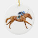 Conception originale de beaux-arts d'un jockey et d'un cheval de course par l'illustrateur Carolyn McFann du studio de ronronnement de deux chats sur un ornement de vacances de qualité pour les supporters équestres.