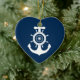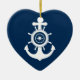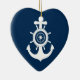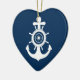 Ornement en forme de coeur personnalisable avec l'illustration nautique de thème comportant une ancre, un volant et un logo blancs de boussole sur le bleu marine.