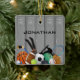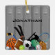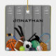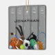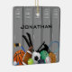 Locker Room Design Ornament, avec divers équipements sportifs devant un ensemble de casiers. Tout le texte personnalisable, avant et arrière !