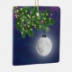 Un ornement de Noël de pleine lune qui brille accroché à une touffe de pin vert avec des lumières féeriques brillantes sur un arrière - plan étoilé. Le texte en arrière est modifiable.