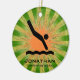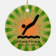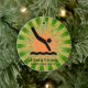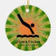 Ornement personnalisé de plongeur Noël 20XX. Un plongeur en mouvement contre un arrière - plan de starburst vert et orange. Tout le texte personnalisable, avant et arrière !
