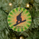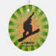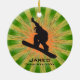 Snowboard Ornement personnalisé Noël 20XX. Un snowboardeur pose sur une planche contre un arrière - plan de starburst vert et orange. Tout le texte personnalisable, avant et arrière !