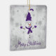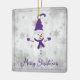 Décorez votre arbre cette saison de vacances avec un ornement en céramique violet mignon Snowman Holiday. Le design ornemental présente un mignon bonhomme de neige dans un casquette, foulard et gants ornés de flocons de neige gris et blanc contre un arrière - plan gris grunge. Autres cadeaux et objets de vacances disponibles avec ce design aussi.