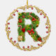 ornement décoré d'un monogramme initial de Noël de R - cercle. Cette décoration exquise d'arbre de Noël de la lettre R donnera à votre Noël un contact traditionnel avec une sensation personnalisée moderne. A conçu pour ressembler à un arbre de sapin couvert de présents et des cadeaux cette lettre a sur un ornement circulaire est entourés par un cadre d'or avec les baies rouges. Le haut de gamme et tendent dessus ceci est un luxe abordable pour vous les besoins de décor de vacances. Le double a dégrossi pour l'impact supplémentaire ce vert et l'image rouge sur un arrière - plan de blanc neigeux est un favori avec des entreprises également. Alphabet en entier disponible.