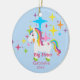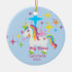 Voulez quelque chose spéciale pour cet enfant de mêmes parents plus âgé ? Cet ornement sera un souvenir depuis de nombreuses années à venir. Il a l'arrière - plan bleu-clair avec une vague des étoiles colorées lumineuses. Il y a une licorne avec une crinière et une queue lumineuses et colorées. Personnalisez avec un nom et une année. Nous avons également une petite soeur, et une soeur moyenne dans cette conception.