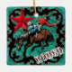 Ornement d'équitation de bronc de cowboy de rodéo avec l'ornement en céramique d'arrière - plan de cuir de faux