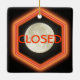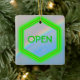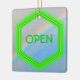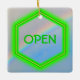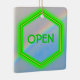 Des hexagones de charpente de fil aux couleurs "néon" indiquent l'accès à la pièce sur laquelle il est accroché. Un côté de médaillon a un hexagone vert avec le mot "Open" l'arrière - plan un ciel bleu avec arc-en-ciel. L'autre côté a un hexagone rouge avec "Fermé" l'arrière - plan est noir avec pleine lune.