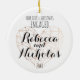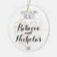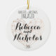 Notre premier Noël engagé ou ensemble ou a marié l'ornement comportant un coeur géométrique de bel or rose ! Personnalisé avec vos noms dans la police typographique de manuscrit.