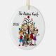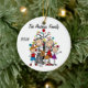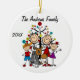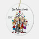 Un joli ornement de Noël en céramique ronde avec un personnage en bâton papa, maman, garçon en casquette de baseball, fille en robe violette, un chat, et le chien de famille devant le sapin décoré de Noël et les zones où vous pouvez ajouter du texte y compris l'année en cours et le nom de famille. C'est un cadeau adorable que toute famille peut offrir pour commémorer l'année !