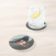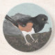 Dessous de verre avec mon image médiatique mixte originale d'une broche de l'Est sur le sol parmi les aiguilles de sapin et les brindilles tombées. L'oiseau d'aquarelle est principalement noir avec une poitrine blanche et des côtés de couleur rouille. Derrière, il y a une grande pierre contre un arrière - plan pâle et vert pâle.