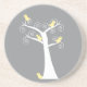 Cinq adorables oiseaux jaunes abstraits pendent dans un arbre blanc contre un arrière - plan gris sur un dessous de verre