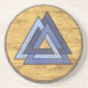 Des dessous de verre astucieux de boissons comportant la conception classique de Valknut au-dessus de l'arrière - plan en bois admirablement patiné de bouclier de Viking.