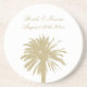 Dessous de verre de mariage de plage de grès avec imprimé palmier. Modèle design exotique avec silhouettes de palmiers tropicaux. Personnalisez avec les noms de la mariée et du marié. Partie d'un beau thème assorti impliquant une décoration de table classe et de papeterie élégante. Couleurs beiges de sable neutre. Décor de luxe idées et cadeaux.